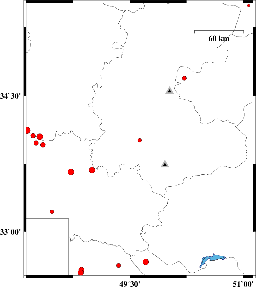 2014/06/13 | 00:56:37.4 | 05:26:37.4 | 34.69 | 50.22 | 41 | ML:2.6 | Qom Province, 18 km East of Tafresh | ||