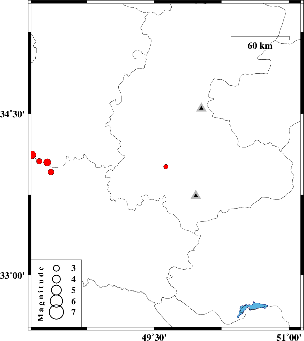 2014/06/29 | 01:25:46.7 | 05:55:46.7 | 34.06 | 48.22 | 14 | ML:2.8 | Lorestan Province, 23 km East of Nurabad | ||