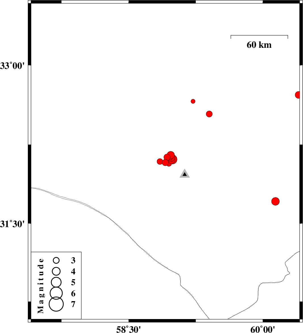 2014/07/01 | 21:13:45.9 | 01:43:45.9 | 32.13 | 58.93 | 6 | ML:3.2 | Khorasan(south) Province, 90 km South-West of Birjand | ||