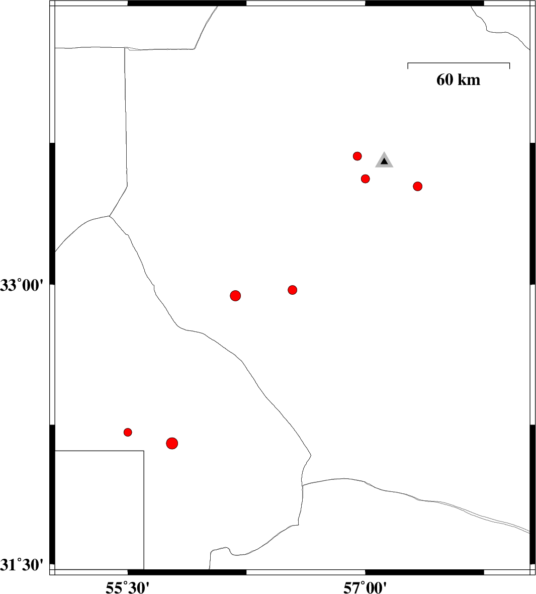 2014/06/09 | 23:00:31.4 | 03:30:31.4 | 32.94 | 56.18 | 37 | ML:3 | Yazd Province, 101 km South-West of Tabas |