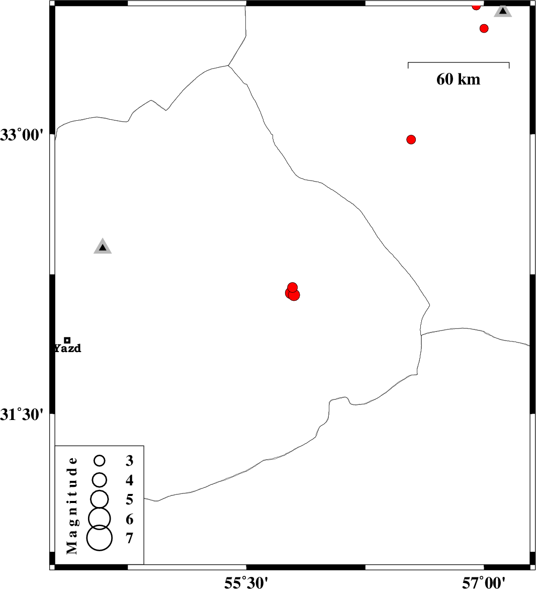 2014/07/06 | 03:22:13.5 | 07:52:13.5 | 32.14 | 55.8 | 14 | ML:3.2 | Yazd Province, 71 km North-East of Bafq | ||