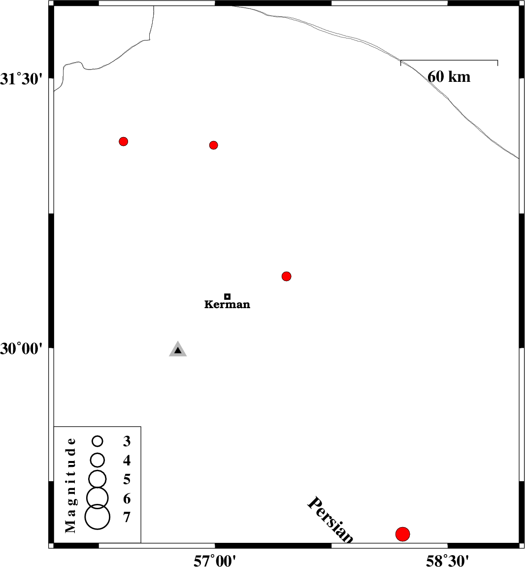 2014/07/07 | 18:39:54.9 | 23:09:54.9 | 30.4 | 57.46 | 14 | ML:2.7 | Kerman Province, 38 km North-East of Kerman | ||
