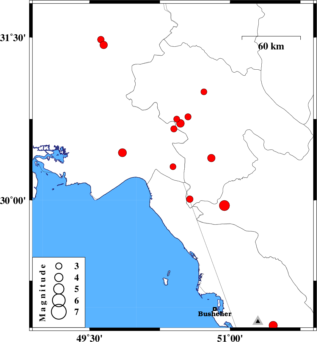2014/06/20 | 02:54:01.3 | 07:24:01.3 | 28.83 | 51.46 | 15 | ML:4.1 | Bushehr Province, 21 km East of Ahram | ||