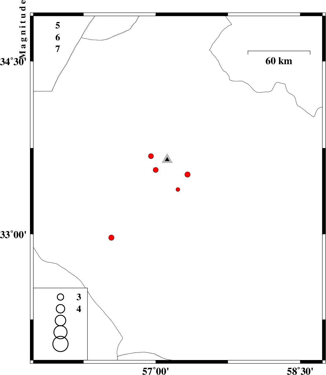 2014/07/06 | 03:22:13.5 | 07:52:13.5 | 32.14 | 55.8 | 14 | ML:3.2 | Yazd Province, 71 km North-East of Bafq | ||