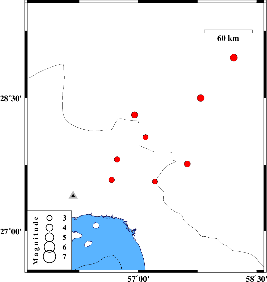 2014/07/07 | 02:11:14.9 | 06:41:14.9 | 27.58 | 56.66 | 6 | ML:3.2 | Hormozgan Province, 60 km North-West of Dehbarez | ||
