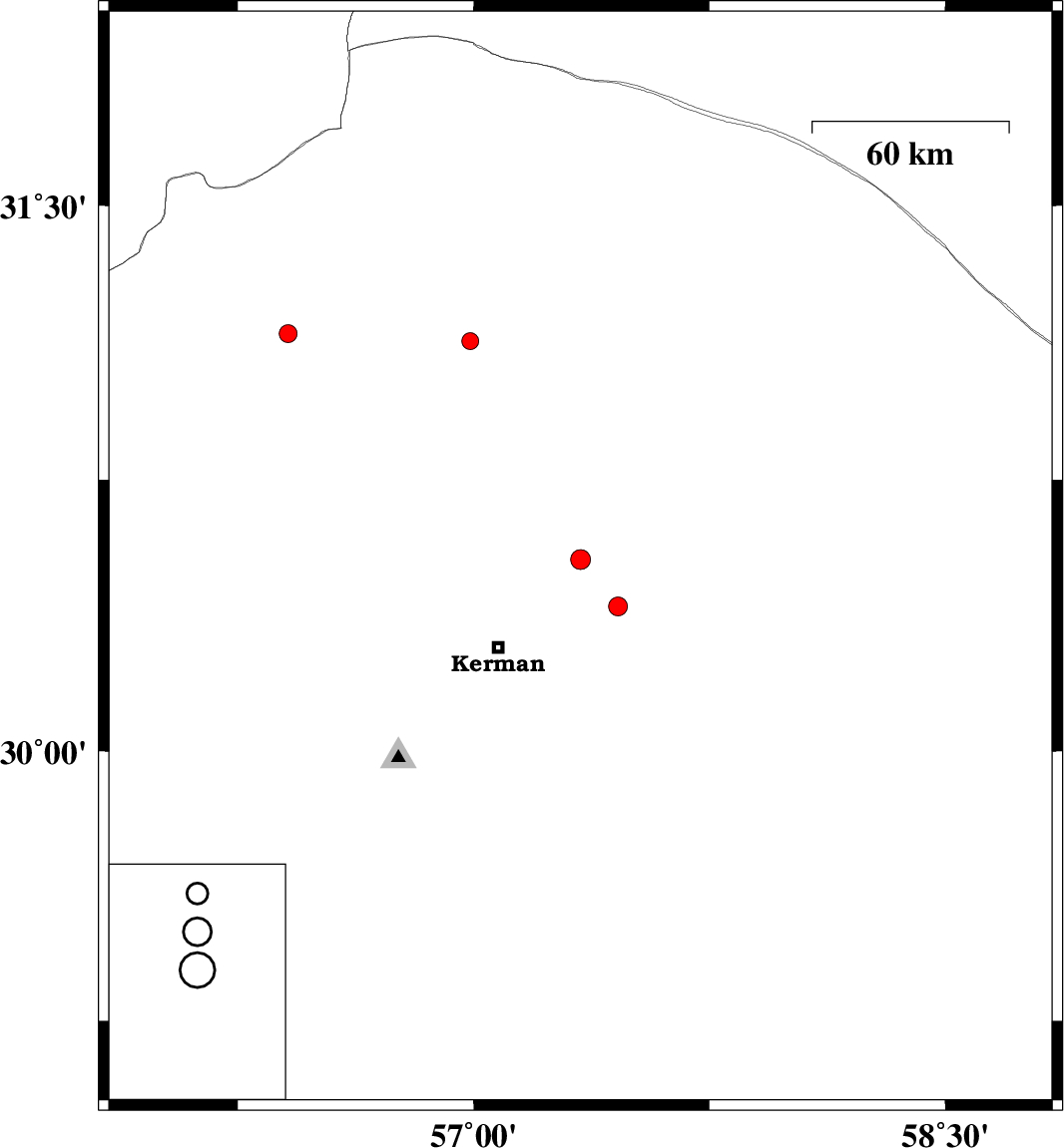 2014/07/07 | 18:39:54.9 | 23:09:54.9 | 30.4 | 57.46 | 14 | ML:2.7 | Kerman Province, 38 km North-East of Kerman | ||