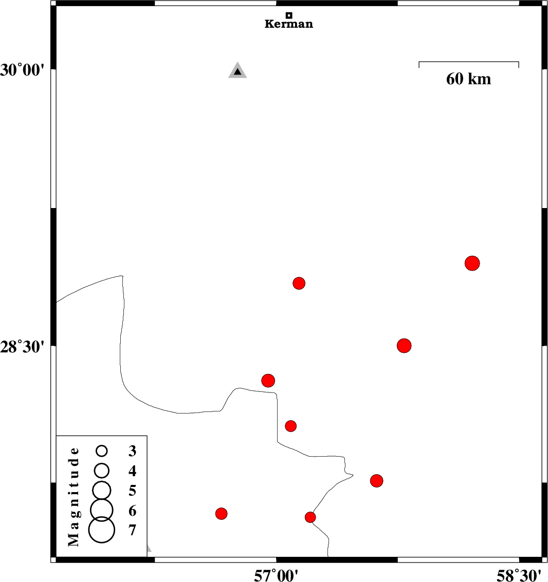 2014/06/25 | 14:20:11.1 | 18:50:11.1 | 27.76 | 57.62 | 14 | ML:3.5 | Kerman Province, 22 km South of Kahnuj | ||