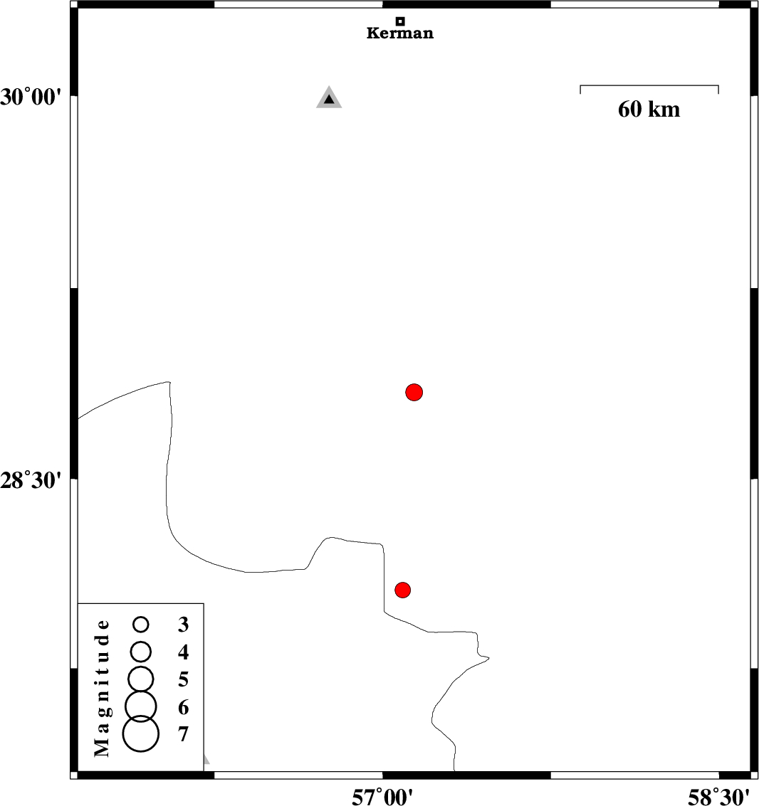 2014/07/14 | 20:59:59.6 | 01:29:59.6 | 28.06 | 57.09 | 14 | ML:3.1 | Kerman Province, 61 km North-West of Kahnuj |