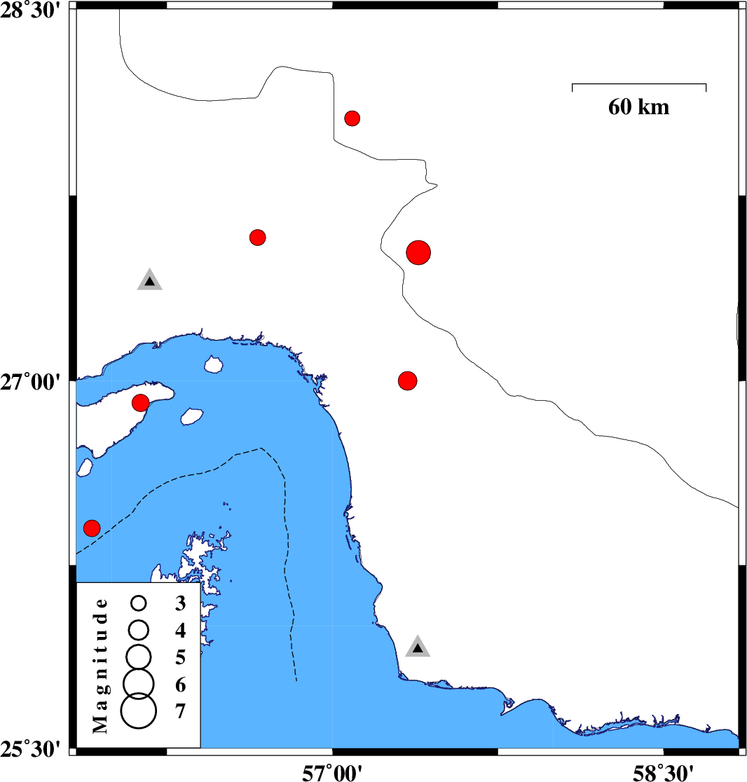 2014/07/07 | 02:11:14.9 | 06:41:14.9 | 27.58 | 56.66 | 6 | ML:3.2 | Hormozgan Province, 60 km North-West of Dehbarez |