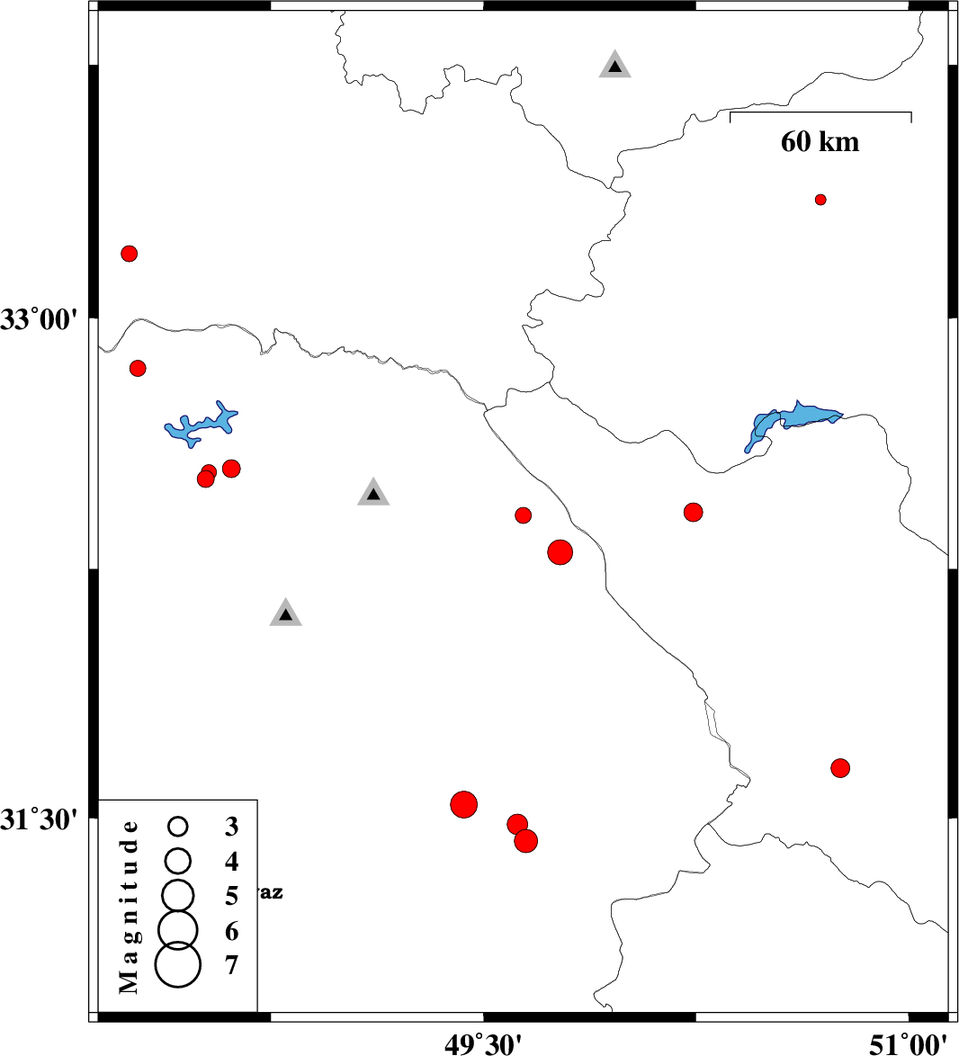 2014/07/31 | 10:20:49.3 | 14:50:49.3 | 32.41 | 49.64 | 14 | ML:2.6 | Khoozestan Province, 45 km West of Chelgard | ||