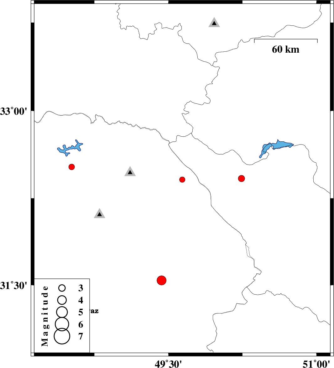 2014/07/31 | 10:20:49.3 | 14:50:49.3 | 32.41 | 49.64 | 14 | ML:2.6 | Khoozestan Province, 45 km West of Chelgard | ||
