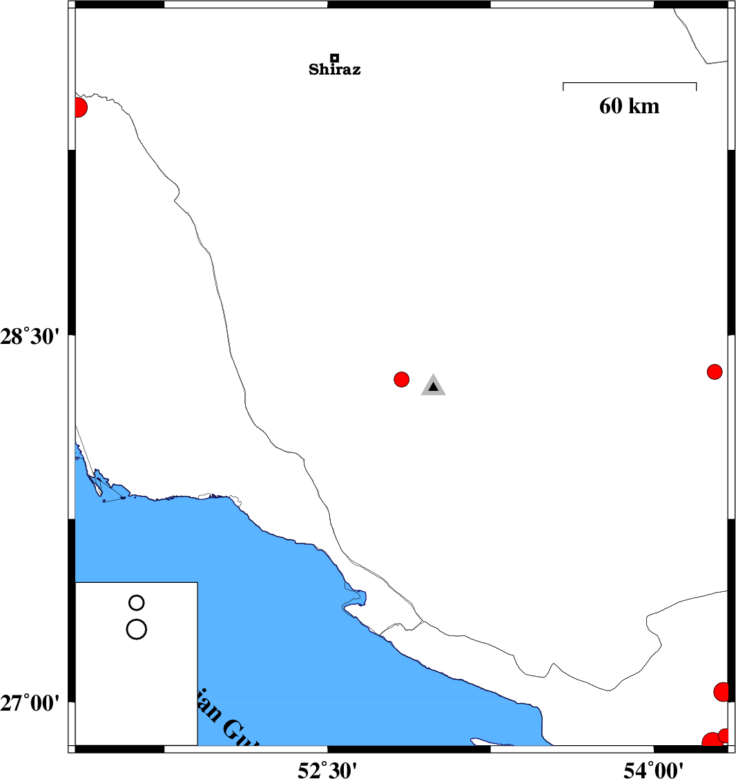| 2014/07/28 | 00:00:42.6 | 04:30:42.6 | 26.83 | 54.27 | 18 | ML:4.4 | Hormozgan Province, 41 km South of Bastak | ||