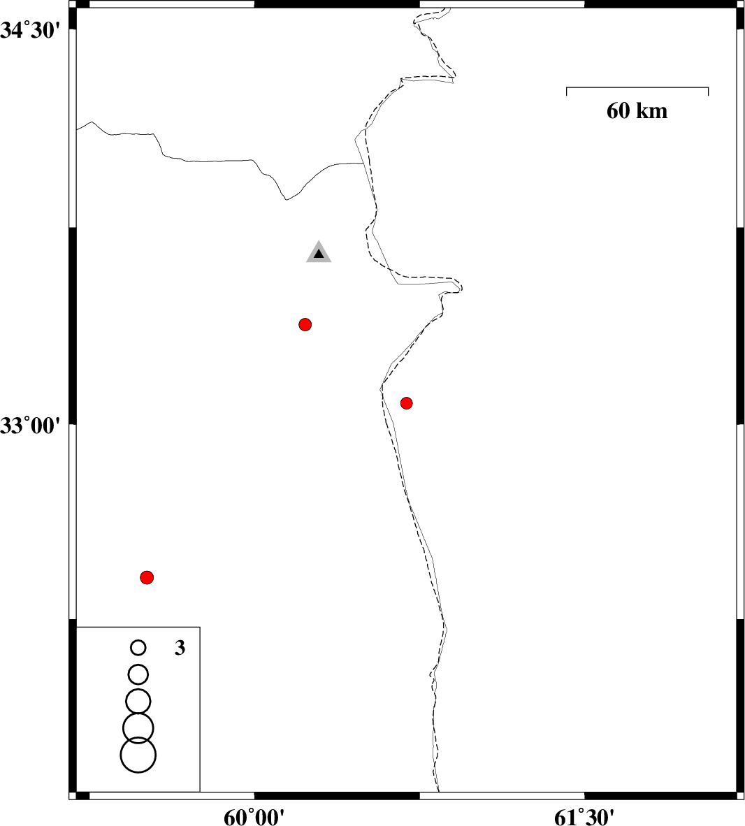 2014/08/21 | 13:18:51.5 | 17:48:51.5 | 33.08 | 60.69 | 16 | ML:2.4 | 98 km North-East of Sarbisheh | ||