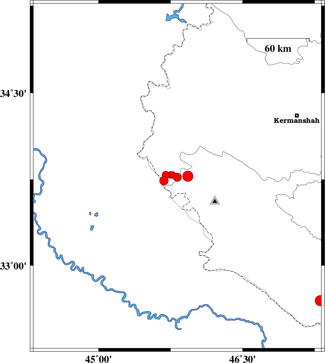 | 2014/08/22 | 20:06:05.4 | 00:36:05.4 | 33.78 | 45.93 | 15 | ML:5 | Ilam Province, 41 km South of Gilan-E-Gharb | ||