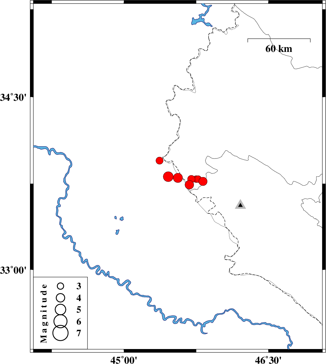 2014/08/31 | 14:44:32.9 | 19:14:32.9 | 33.81 | 45.46 | 17 | ML:4.7 | Iraq, 56 km South-West of Gilan-E-Gharb | ||