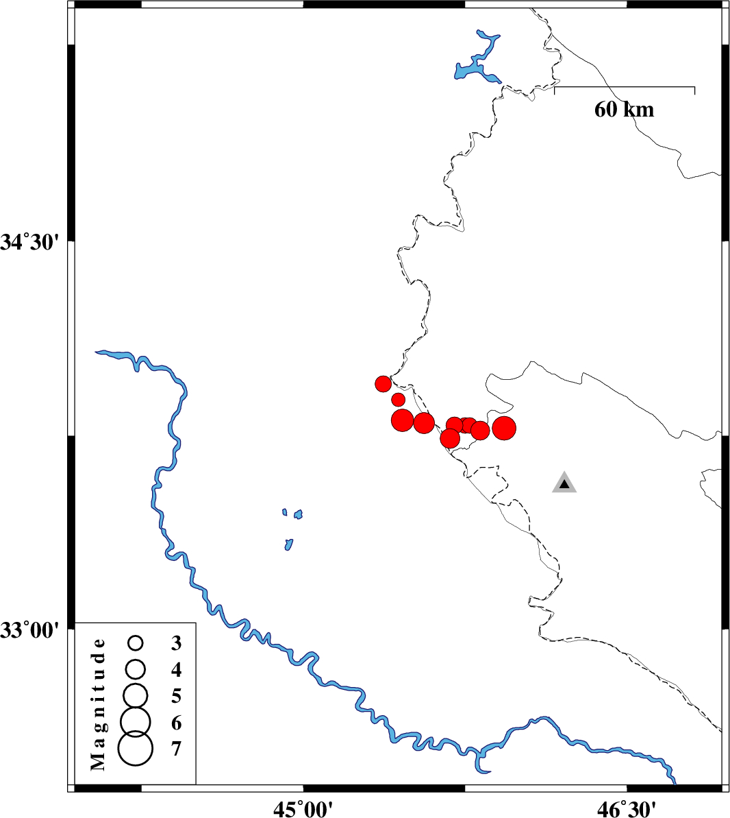 2014/08/31 | 14:44:32.9 | 19:14:32.9 | 33.81 | 45.46 | 17 | ML:4.7 | Iraq, 56 km South-West of Gilan-E-Gharb | ||