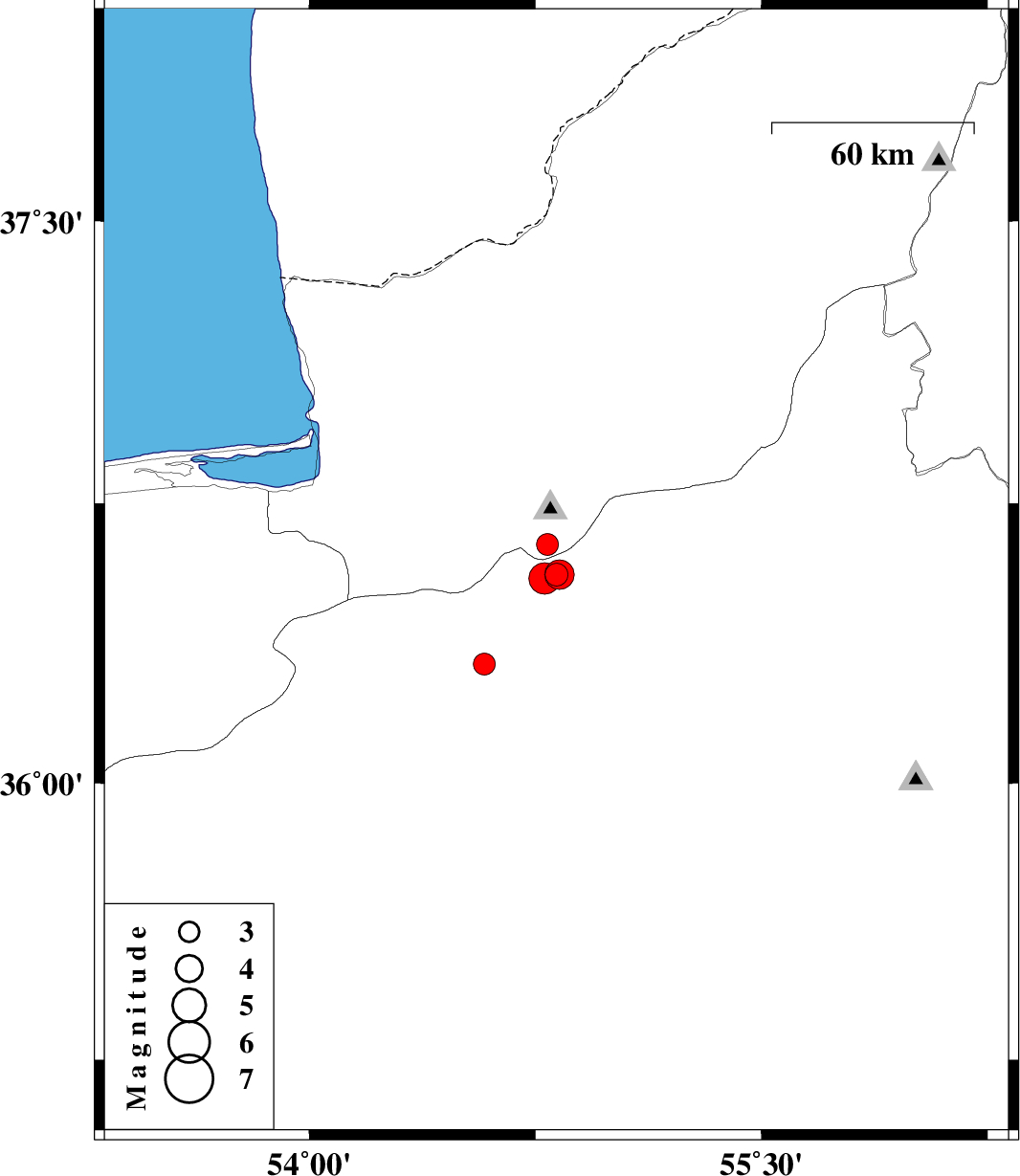 2014/09/05 | 07:48:27.5 | 12:18:27.5 | 36.32 | 54.58 | 14 | ML:3.2 | Semnan Province, 27 km North-East of Damghan |
