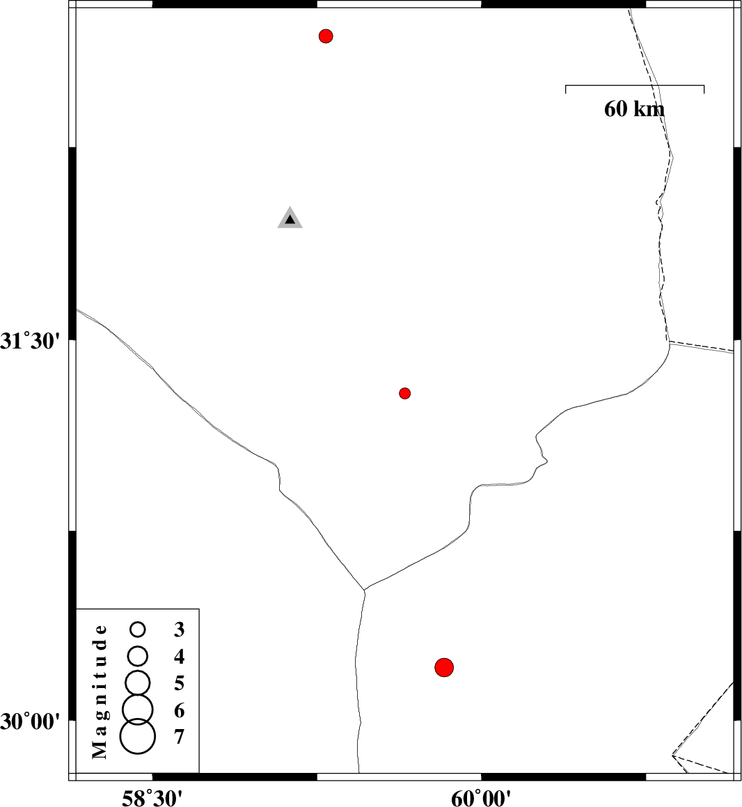 | 2014/09/21 | 15:55:55.3 | 20:25:55.3 | 31.29 | 59.65 | 6 | ML:2.3 | Khorasan(south) Province, 46 km South-West of Nehbandan | ||