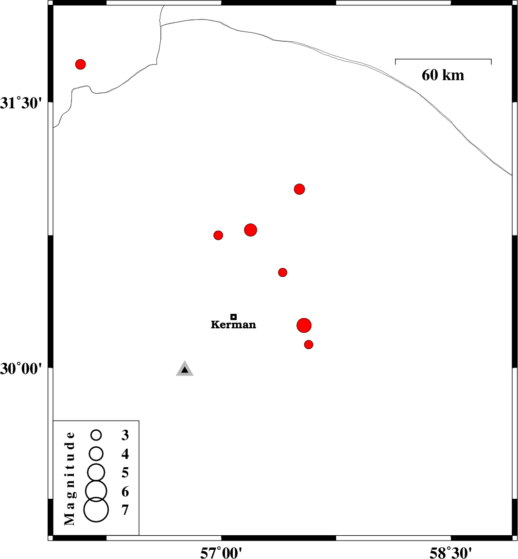 2014/09/23 | 01:22:35.9 | 04:52:35.9 | 30.54 | 57.4 | 18 | ML:2.6 | Kerman Province, 41 km North-East of Kerman | ||