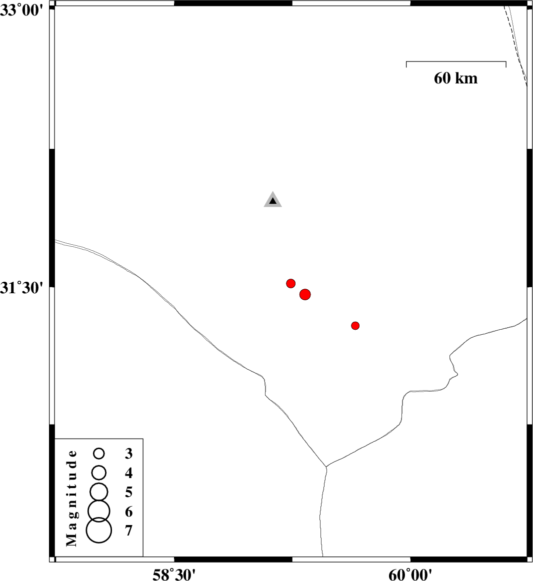 2014/09/23 | 01:39:32.5 | 05:09:32.5 | 31.46 | 59.33 | 18 | ML:3.1 | Khorasan(south) Province, 68 km West of Nehbandan | ||