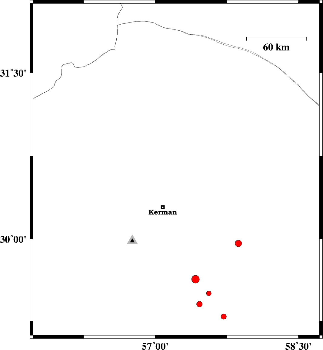 | 2014/09/24 | 03:17:13.2 | 06:47:13.2 | 30.62 | 57.22 | 14 | ML:2.7 | Kerman Province, 39 km North-East of Kerman | ||