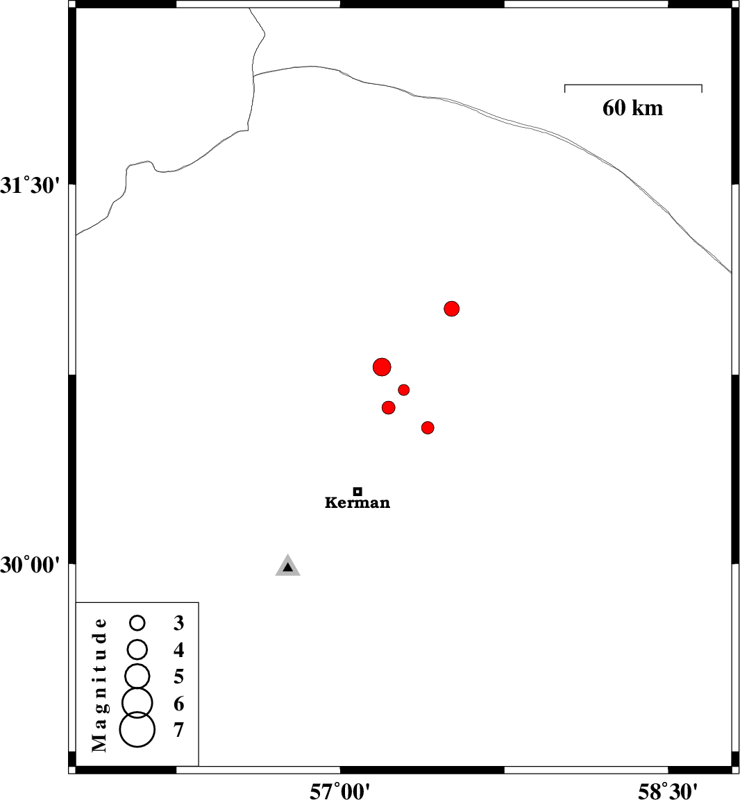 | 2014/09/24 | 03:17:13.2 | 06:47:13.2 | 30.62 | 57.22 | 14 | ML:2.7 | Kerman Province, 39 km North-East of Kerman | ||