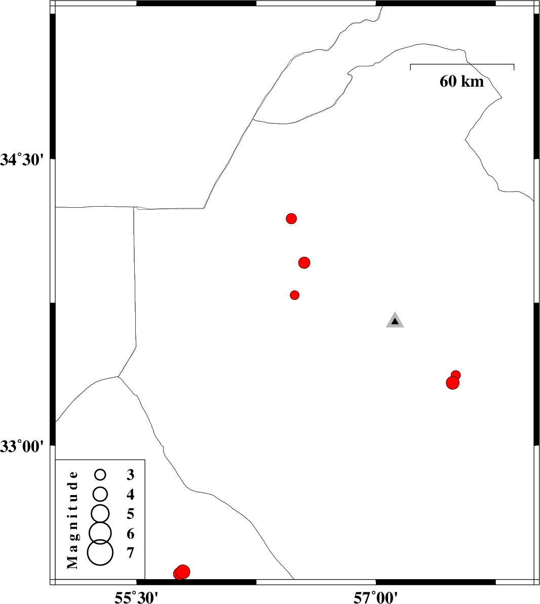| 2014/09/10 | 19:12:28.4 | 23:42:28.4 | 33.37 | 57.5 | 14 | ML:2.7 | Yazd Province, 59 km South-East of Tabas |