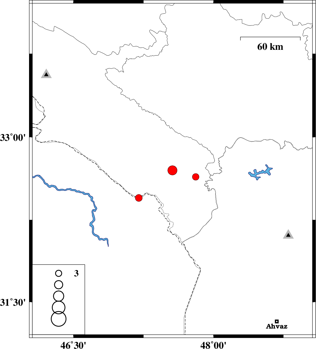 | 2014/09/24 | 13:39:10.2 | 17:09:10.2 | 32.45 | 47.2 | 18 | ML:3.4 | Iraq, 28 km South of Dehloran | ||