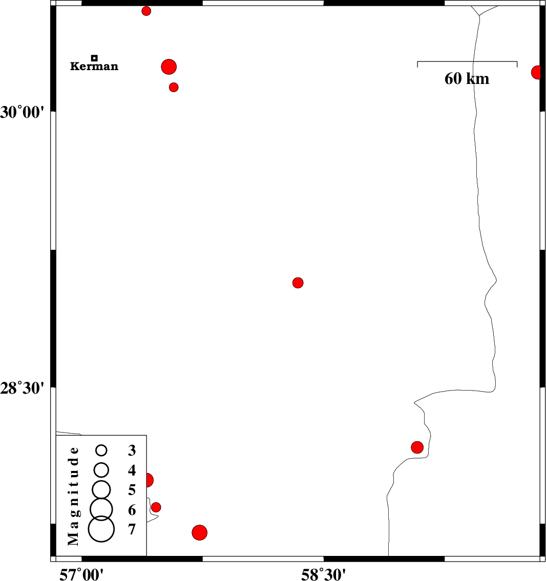 2014/08/31 | 12:14:46.3 | 16:44:46.3 | 27.99 | 57.4 | 18 | ML:3.9 | Kerman Province, 29 km West of Kahnuj |