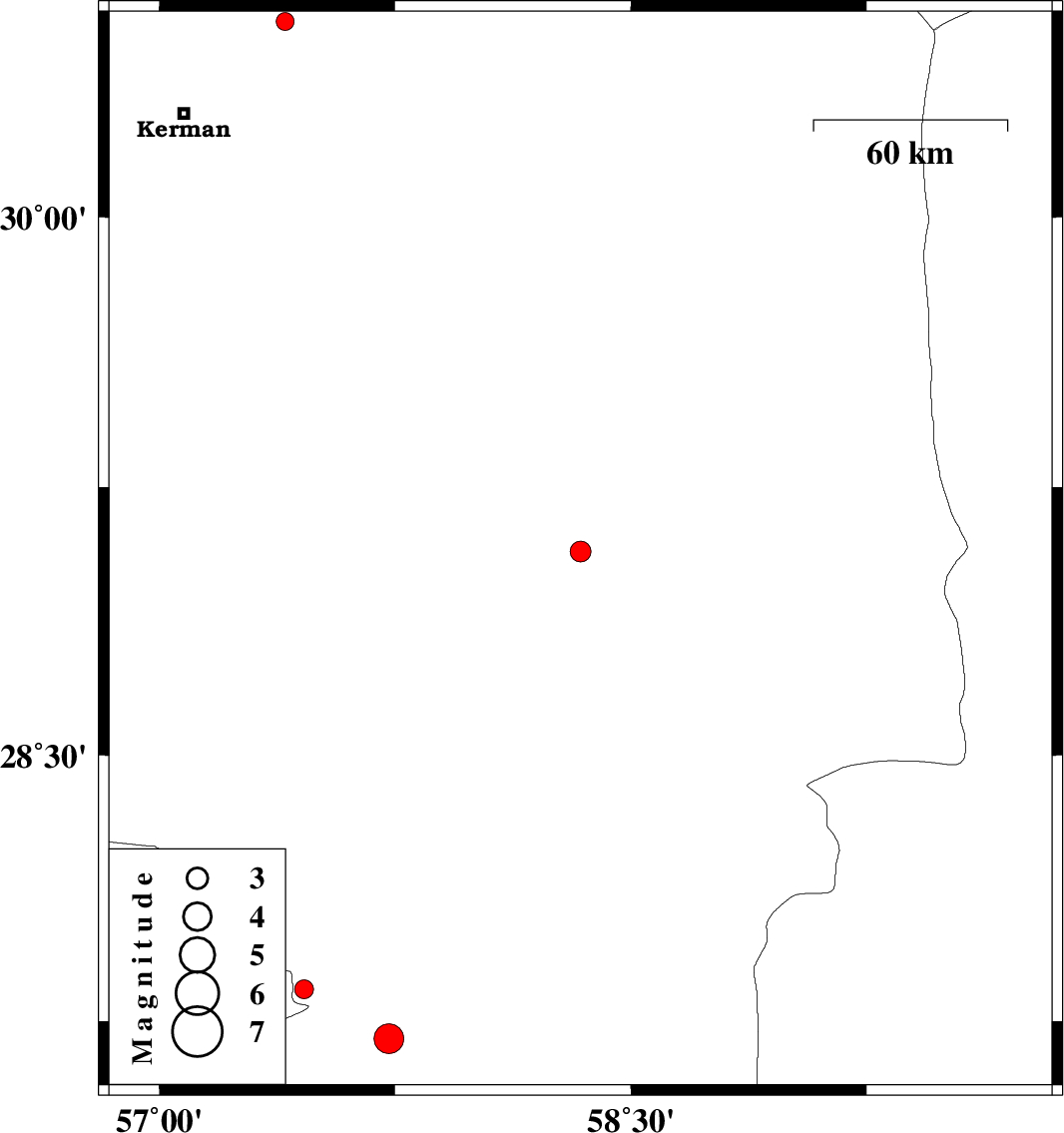 2014/09/28 | 03:33:43.5 | 07:03:43.5 | 27.84 | 57.46 | 14 | ML:2.7 | Kerman Province, 27 km South-West of Kahnuj | ||
