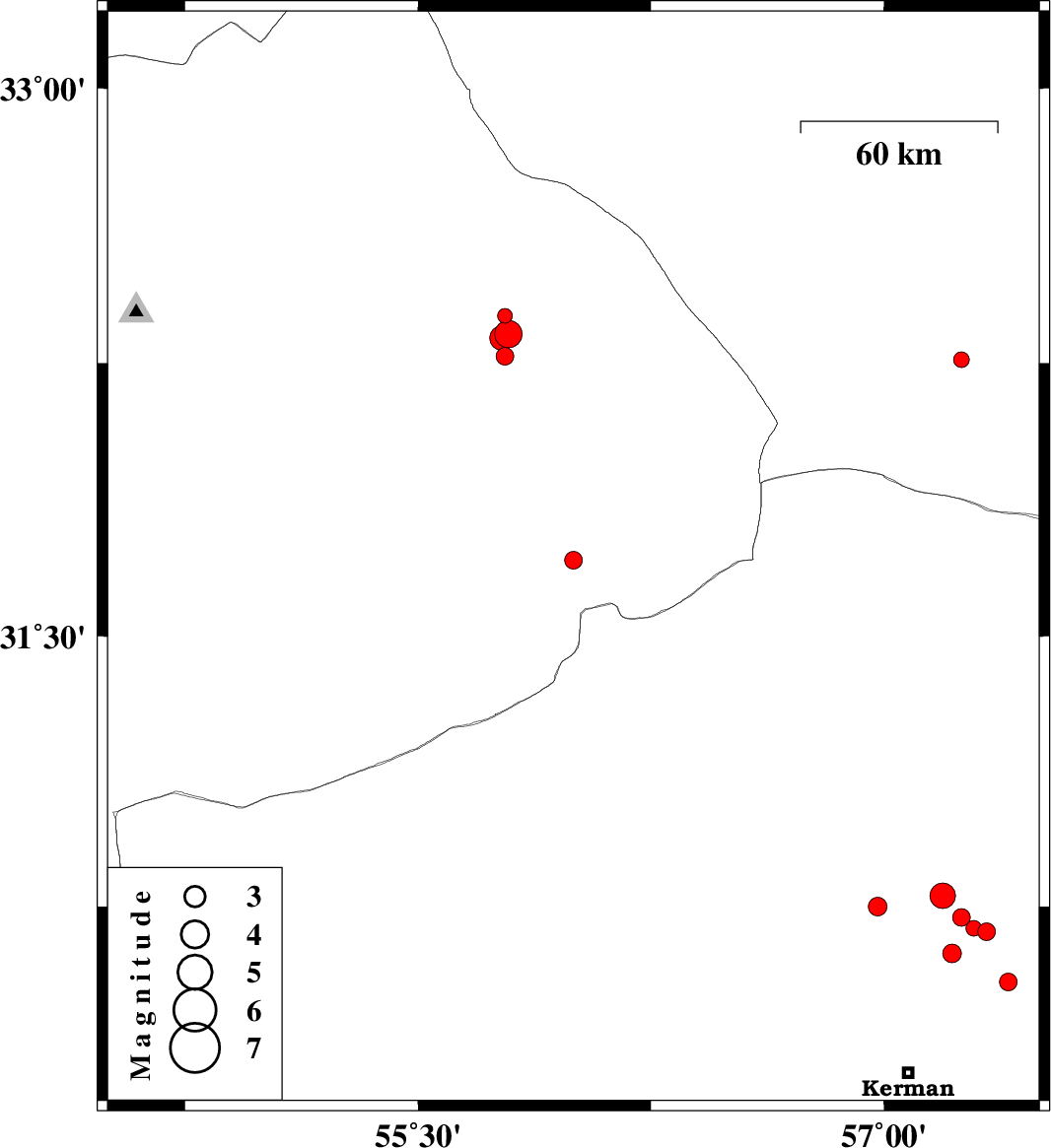 2014/09/23 | 01:22:35.9 | 04:52:35.9 | 30.54 | 57.4 | 18 | ML:2.6 | Kerman Province, 41 km North-East of Kerman | ||