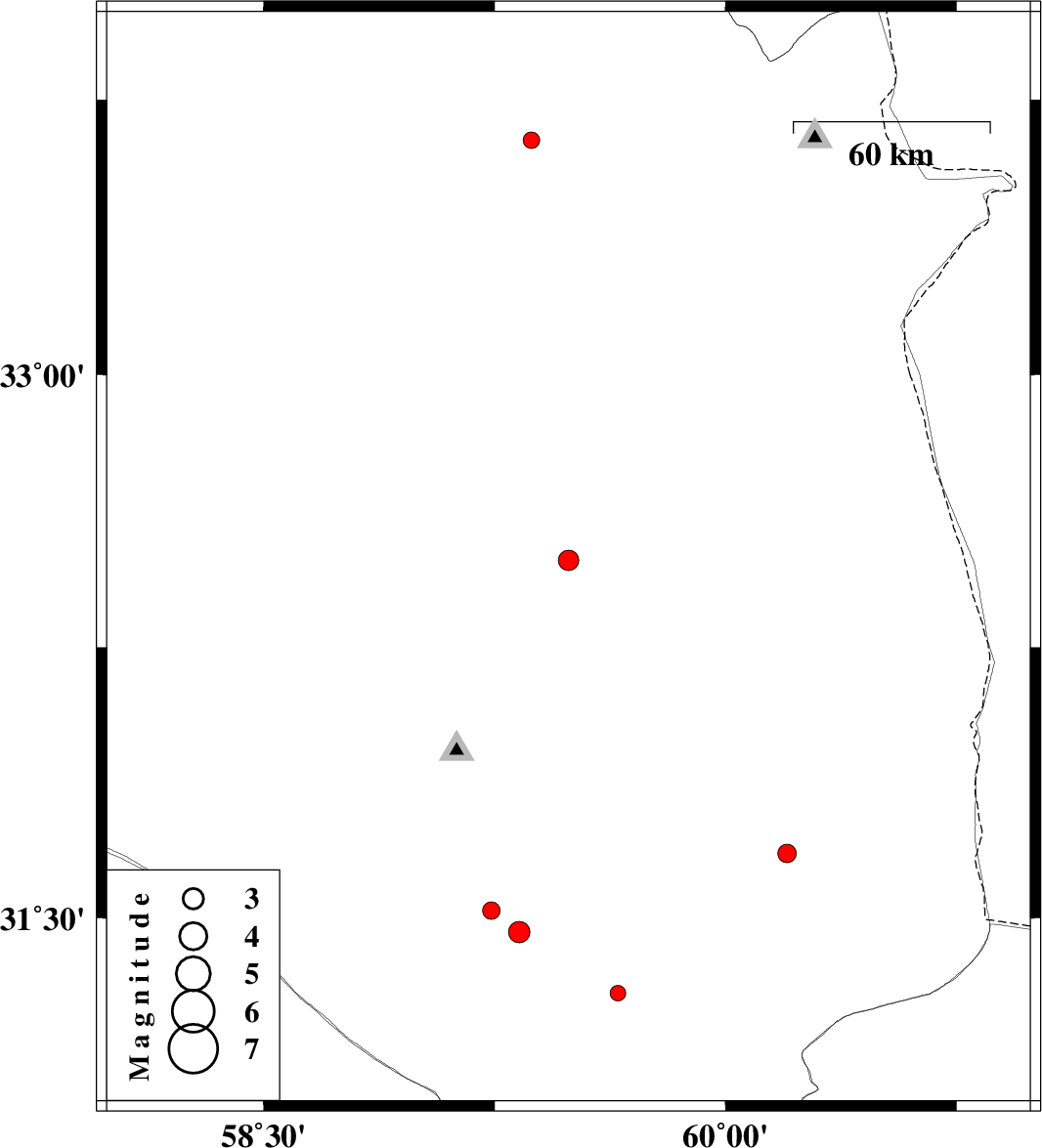 | 2014/09/21 | 15:55:55.3 | 20:25:55.3 | 31.29 | 59.65 | 6 | ML:2.3 | Khorasan(south) Province, 46 km South-West of Nehbandan | ||