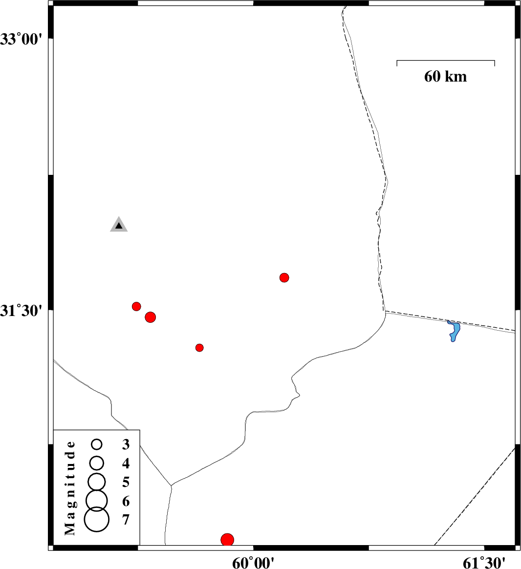 | 2014/09/06 | 02:23:11.7 | 06:53:11.7 | 30.21 | 59.83 | 14 | ML:3.8 | Sistan va Baloochestan Province, 148 km South-West of Nehbandan |