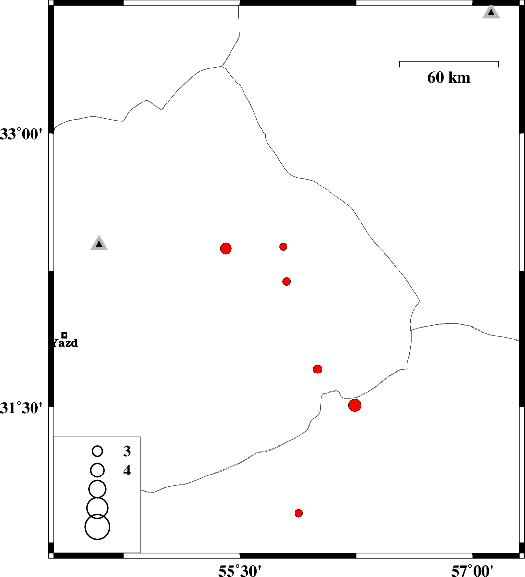 | 2014/10/07 | 17:02:09.2 | 20:32:09.2 | 32.37 | 55.41 | 14 | ML:3.3 | Yazd Province, 86 km North of Bafq | ||