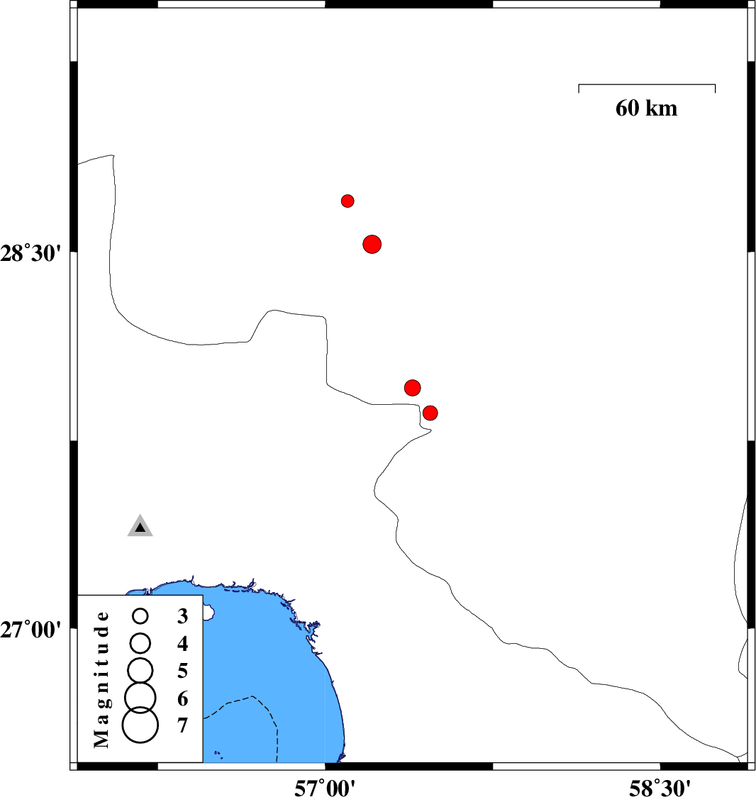 2014/10/08 | 05:59:39.8 | 09:29:39.8 | 27.96 | 57.39 | 14 | ML:3.3 | Kerman Province, 30 km West of Kahnuj | ||