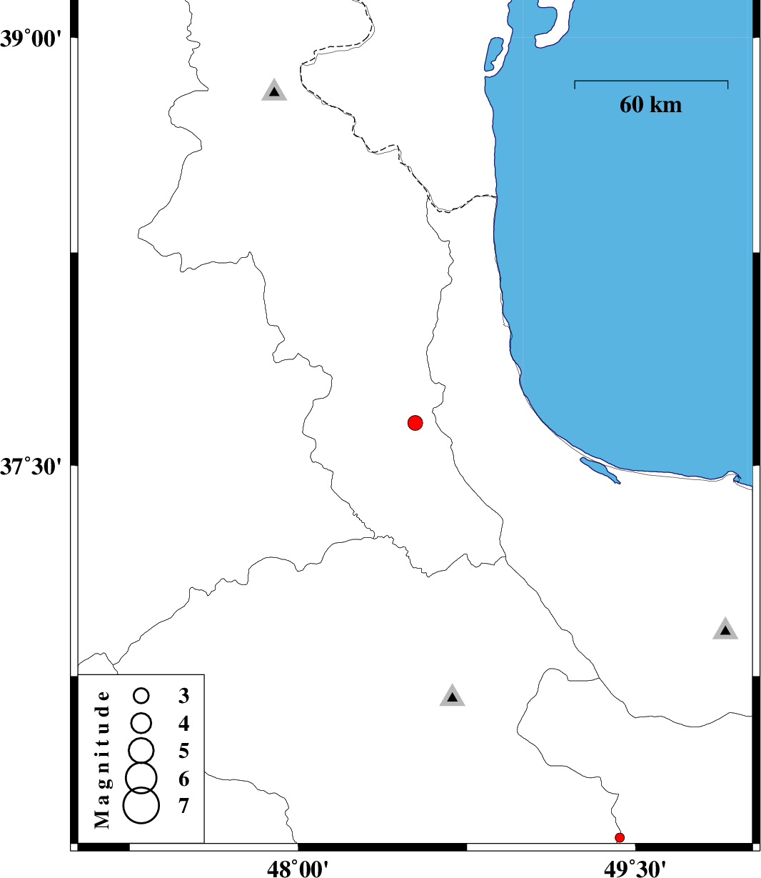 2014/10/12 | 17:31:42.1 | 21:01:42.1 | 37.65 | 48.52 | 14 | ML:2.9 | Ardebil Province, 3 km Khalkhal | ||