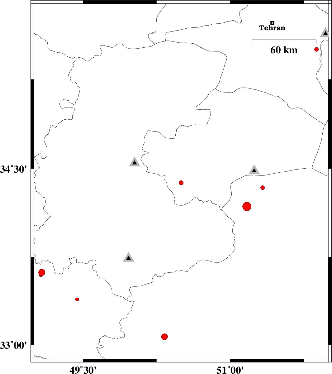 | 2014/10/12 | 12:39:26.6 | 16:09:26.6 | 34.38 | 50.5 | 31 | ML:2 | Qom Province, 52 km North of Mahallat | ||