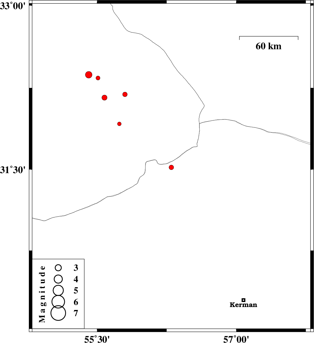 | 2014/10/14 | 10:36:50.1 | 14:06:50.1 | 31.92 | 55.74 | 14 | ML:1.9 | Yazd Province, 48 km North-East of Bafq | ||
