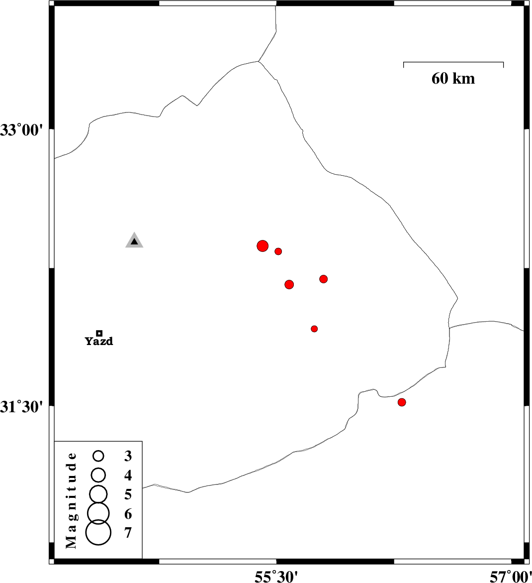 | 2014/10/14 | 10:36:50.1 | 14:06:50.1 | 31.92 | 55.74 | 14 | ML:1.9 | Yazd Province, 48 km North-East of Bafq | ||