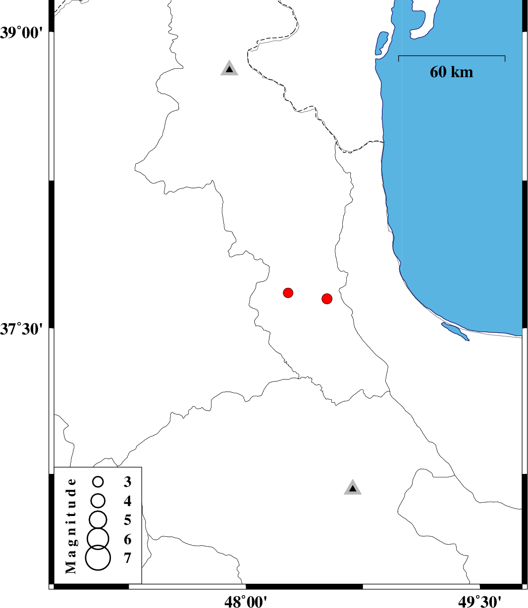 2014/10/12 | 17:31:42.1 | 21:01:42.1 | 37.65 | 48.52 | 14 | ML:2.9 | Ardebil Province, 3 km Khalkhal |