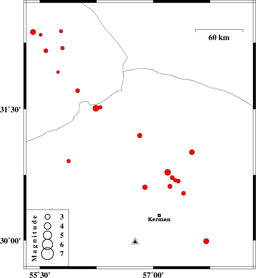 2014/09/26 | 22:13:16.9 | 01:43:16.9 | 30.68 | 57.33 | 14 | ML:2.6 | Kerman Province, 50 km North-East of Kerman | ||