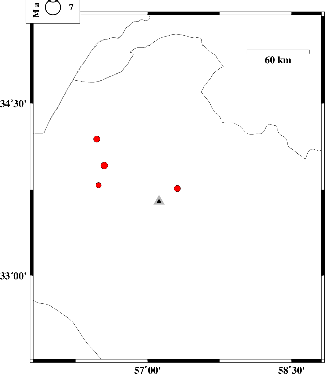 2014/09/24 | 05:47:23.3 | 09:17:23.3 | 34.19 | 56.47 | 14 | ML:3 | Yazd Province, 78 km North-West of Tabas | ||