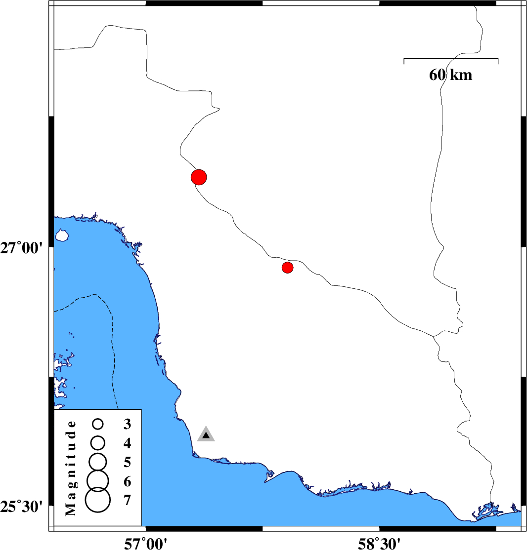 | 2014/10/21 | 22:47:01.5 | 02:17:01.5 | 27.4 | 57.34 | 15 | ML:4.5 | Kerman Province, 10 km Dehbarez |