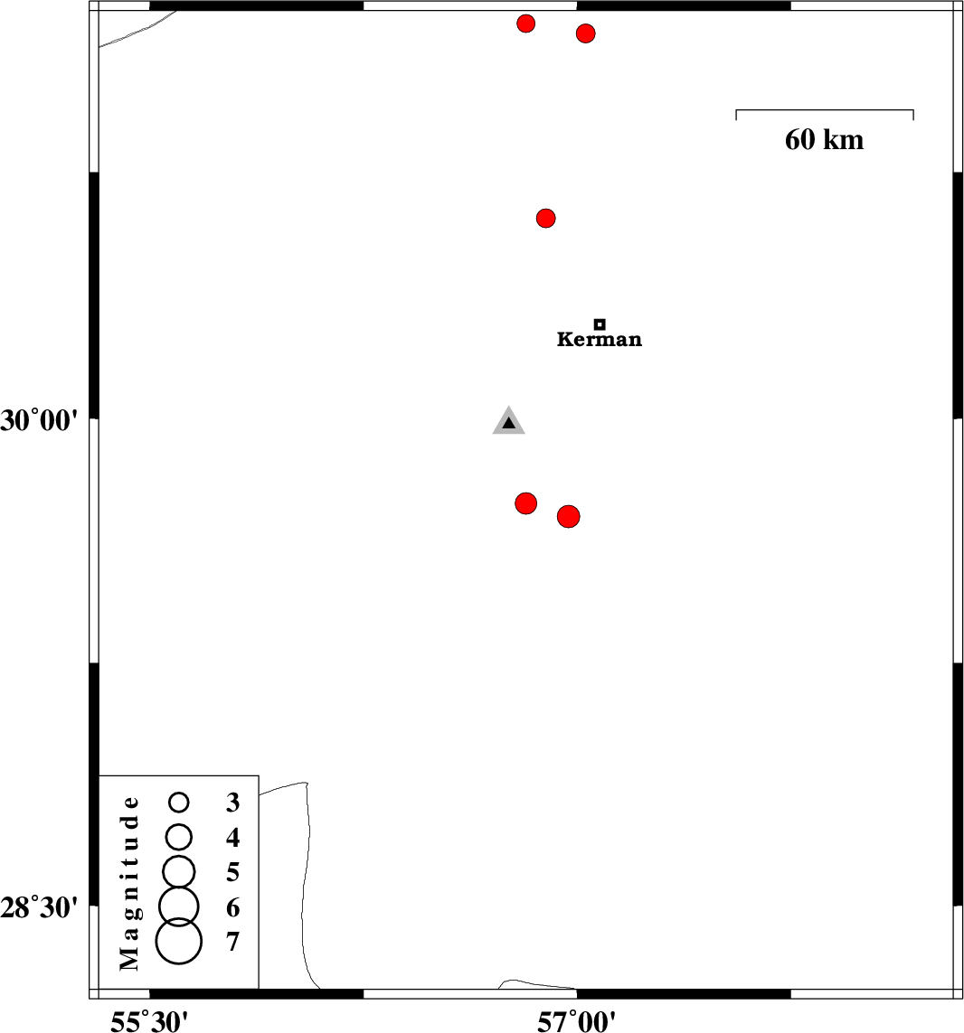 | 2014/10/23 | 06:07:05.2 | 09:37:05.2 | 29.74 | 56.82 | 14 | ML:3.4 | Kerman Province, 31 km South-East of Bardsir | ||
