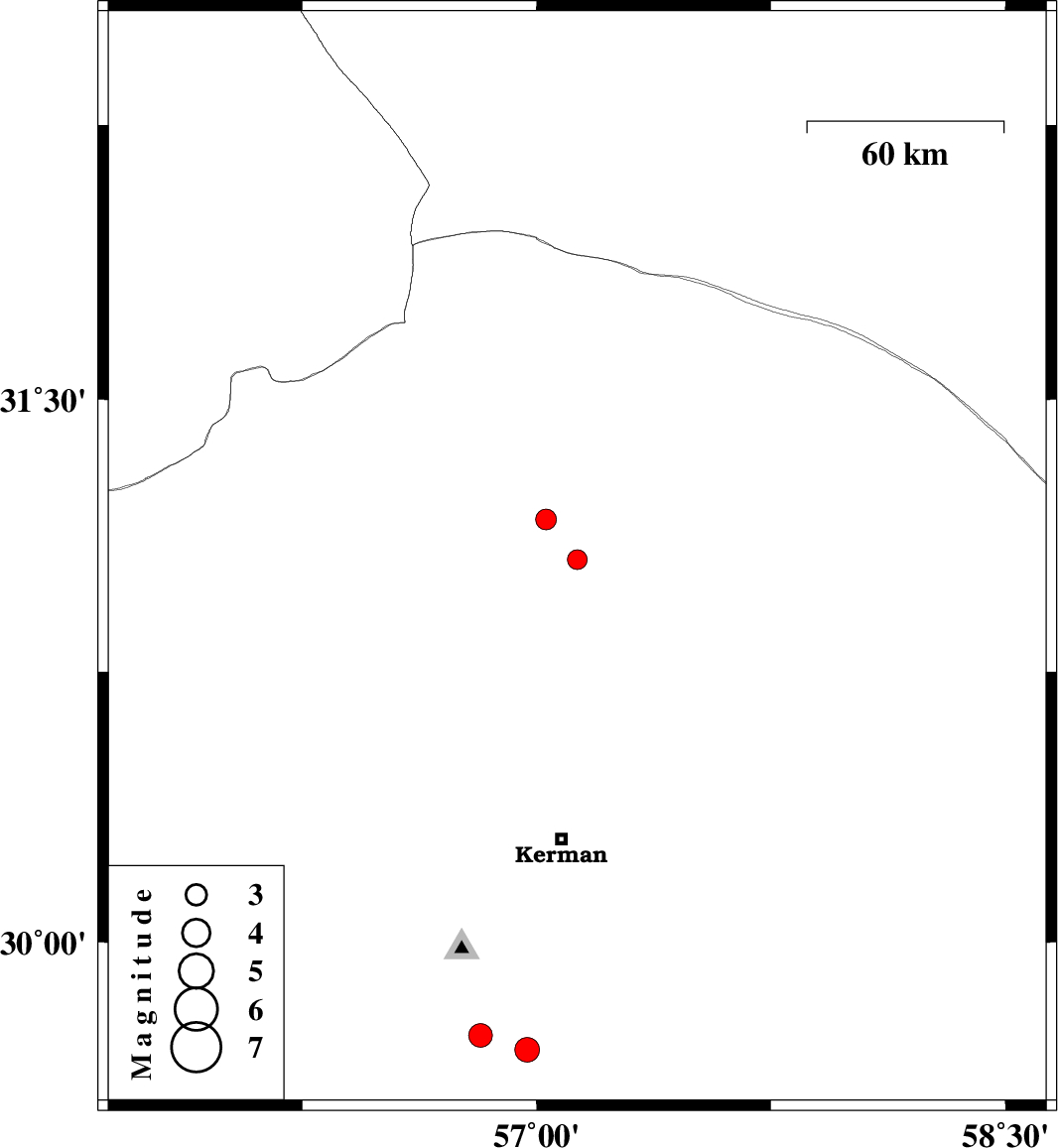 | 2014/10/20 | 00:44:01.7 | 04:14:01.7 | 31.17 | 57.03 | 14 | ML:3 | Kerman Province, 23 km East of Ravar |