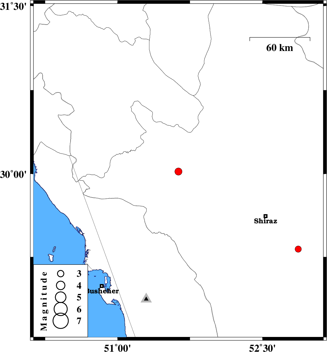 | 2014/10/06 | 01:48:20.6 | 05:18:20.6 | 29.32 | 52.87 | 14 | ML:3 | Fars Province, 62 km South of Marvdasht |