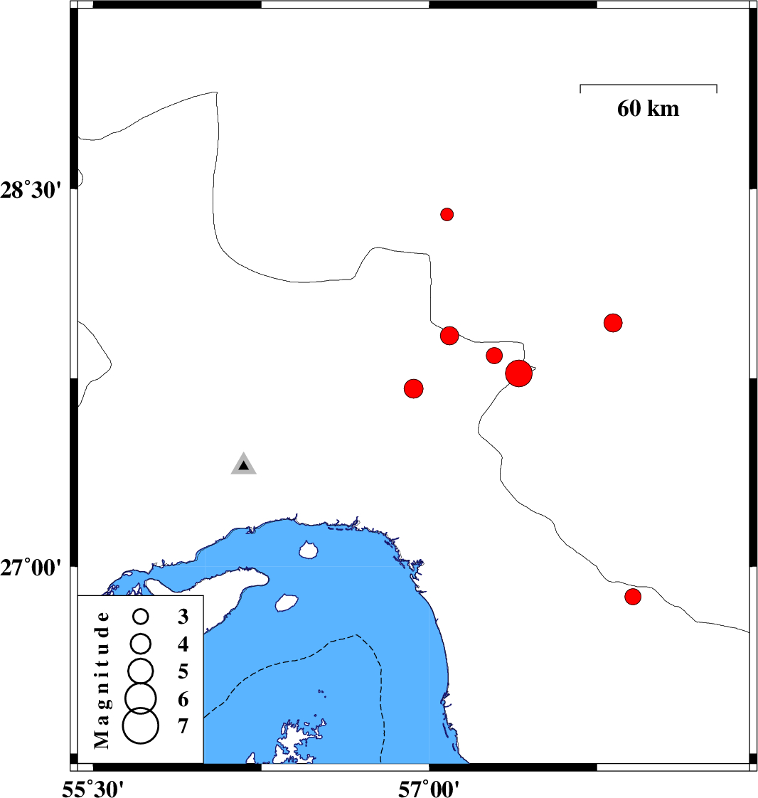 | 2014/10/26 | 10:13:46.7 | 13:43:46.7 | 27.97 | 57.82 | 15 | ML:3.6 | Kerman Province, 13 km East of Kahnuj | ||