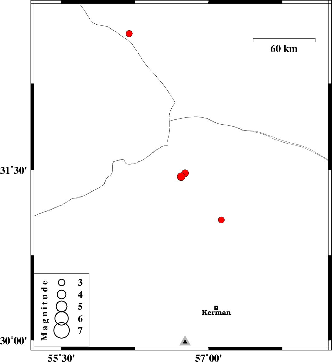 | 2014/10/29 | 09:52:46.5 | 13:22:46.5 | 31.47 | 56.76 | 17 | ML:3.2 | Kerman Province, 23 km North of Ravar | ||
