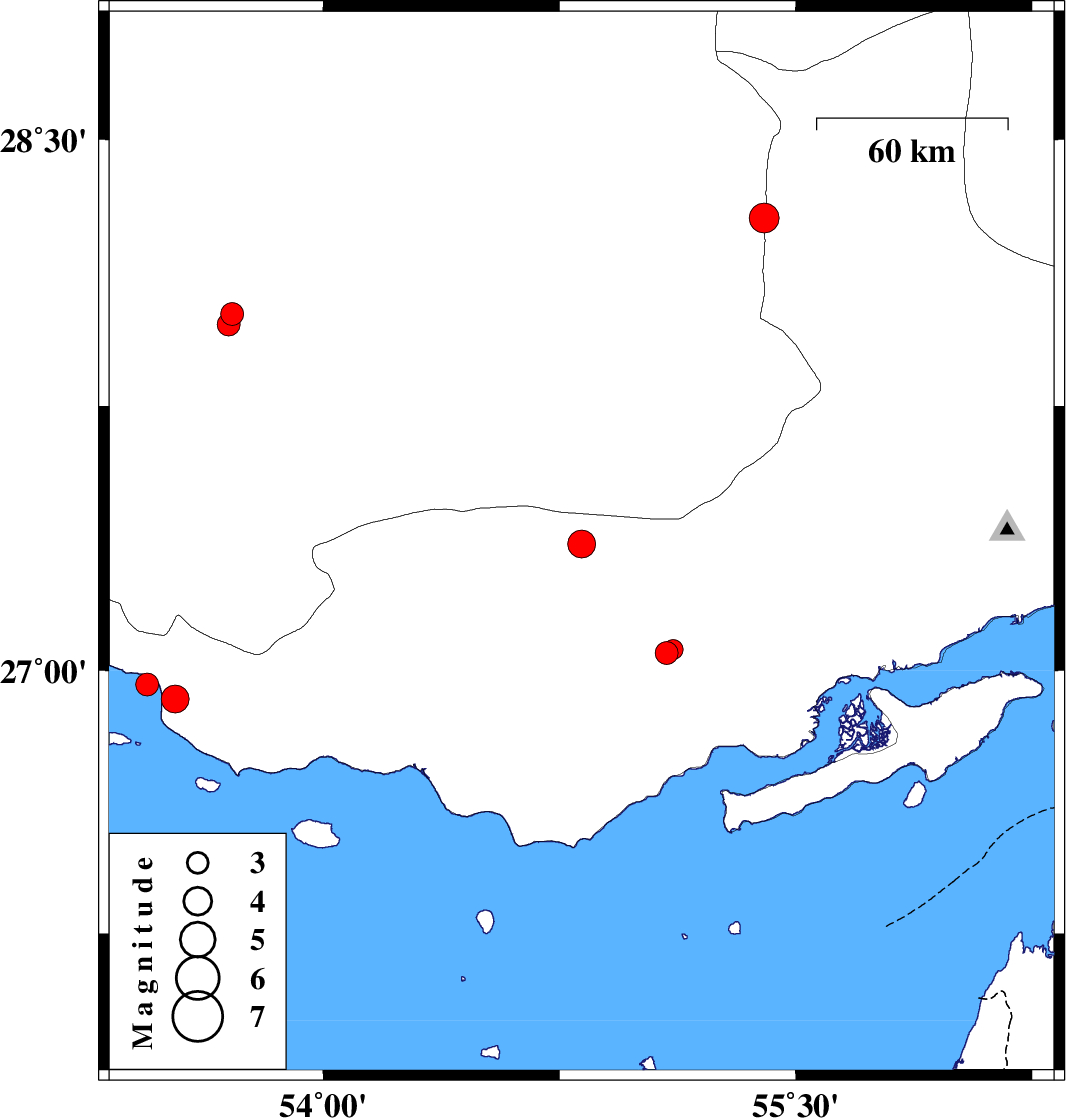 | 2014/10/21 | 02:04:16.5 | 05:34:16.5 | 26.96 | 53.44 | 46 | ML:3.3 | Persian Gulf, 49 km South-East of Lamerd | ||