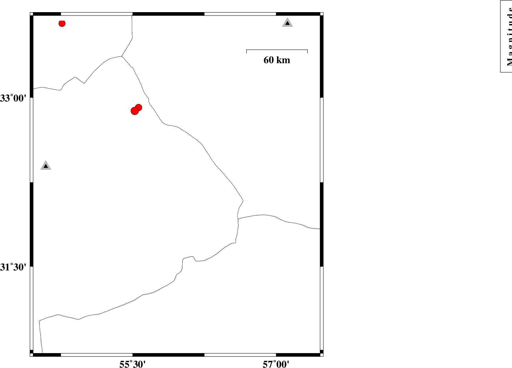 | 2014/11/04 | 17:50:09.1 | 21:20:09.1 | 32.22 | 55.96 | 15 | ML:3.1 | Yazd Province, 87 km North-East of Bafq | ||